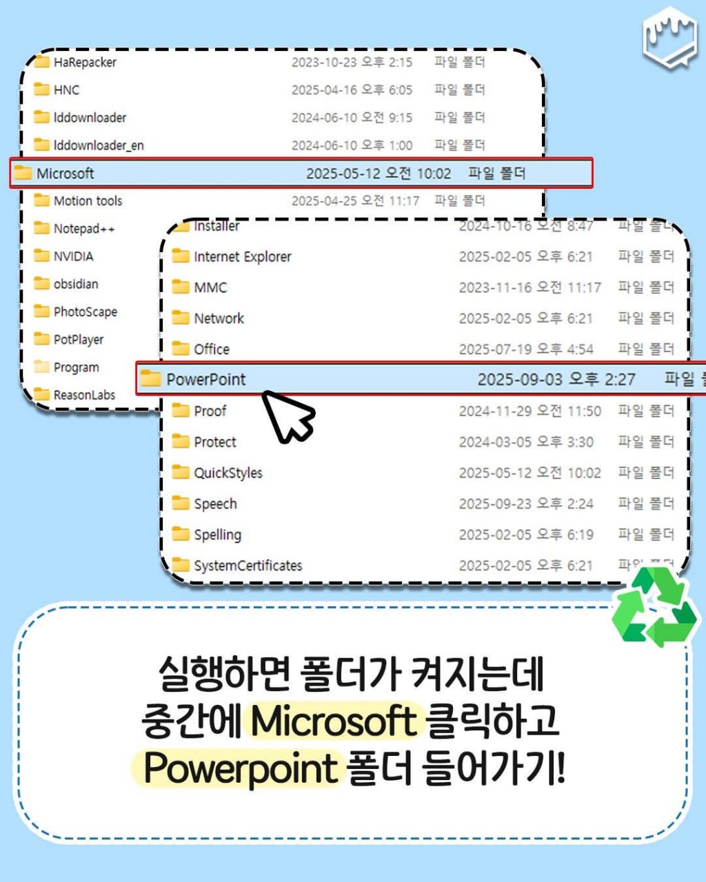- 파워포인트(PowerPoint) 파일 복구 시: PowerPoint 폴더로 들어갑니다.