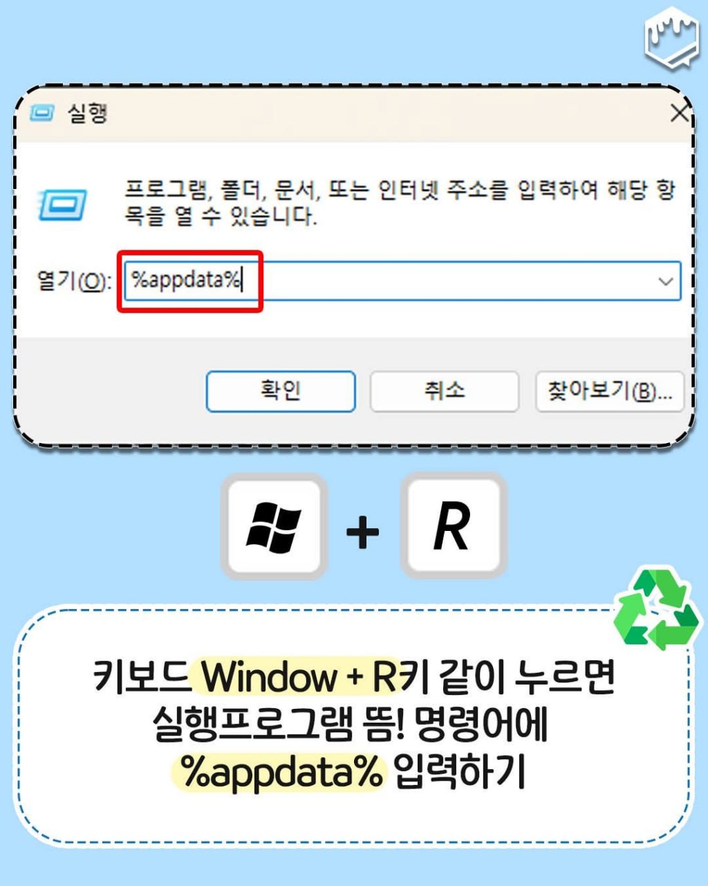 - 명령어 입력: 실행 창이 뜨면, 열기(O) 칸에 %appdata%를 입력하고 확인을 클릭합니다.