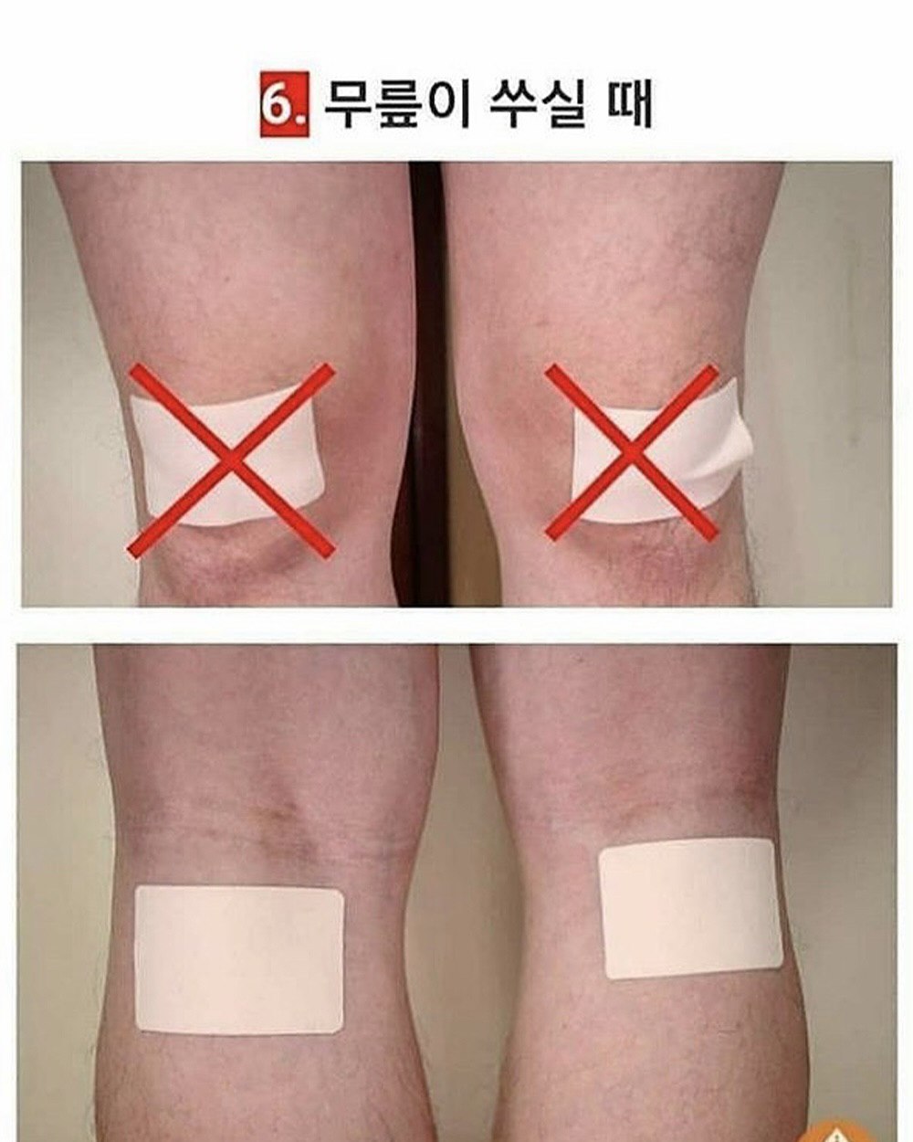 - 잘못된 방법 (X): 무릎 관절의 접히는 중앙 부분에 작게 붙이는 방법.