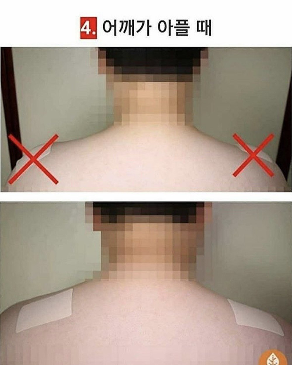 - 잘못된 방법 (X): 어깨 관절 위쪽에 작은 파스를 붙이는 방법.