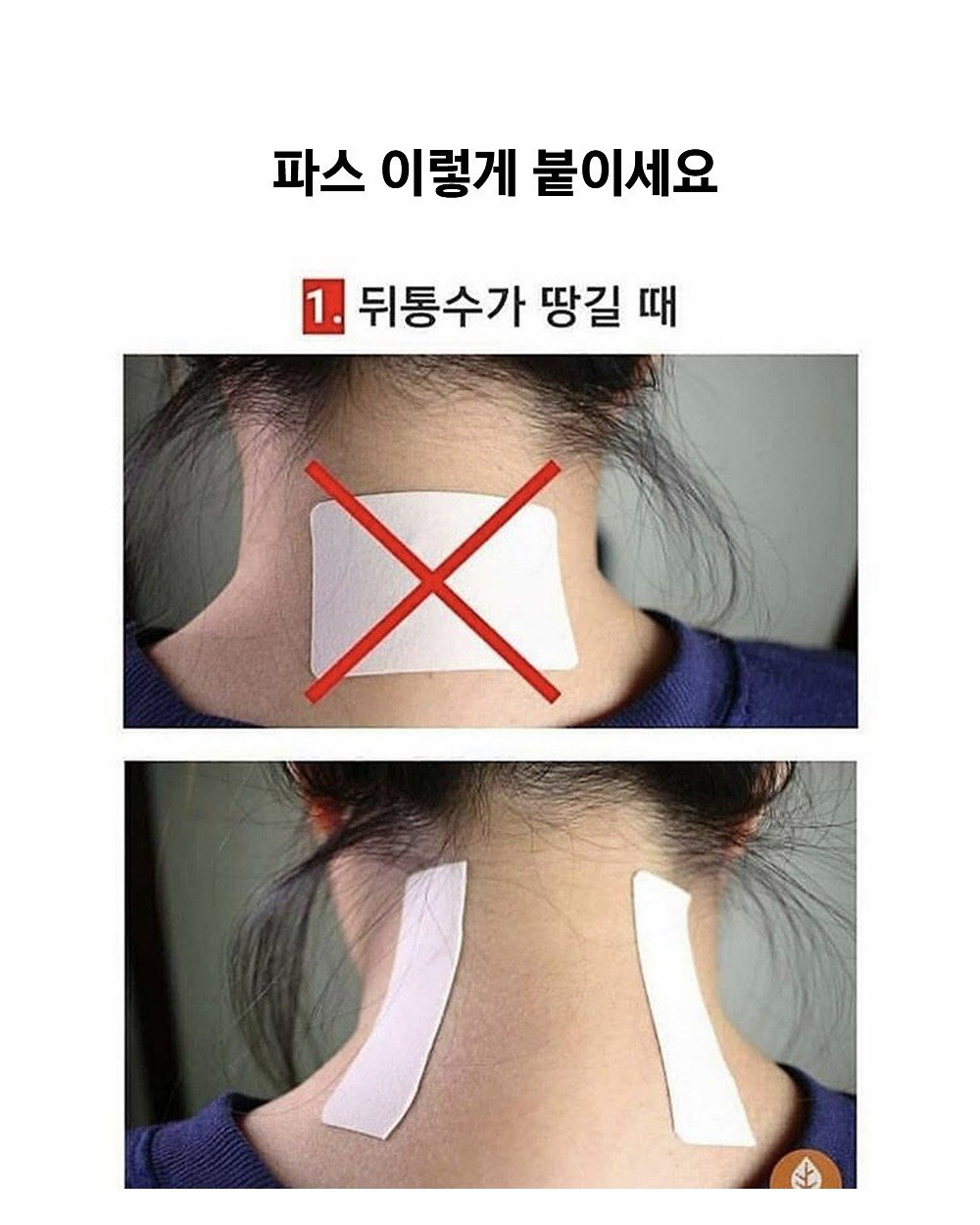 - 잘못된 방법 (X): 목 중앙(경추뼈 위)에 파스를 가로로 하나만 붙이는 방법.