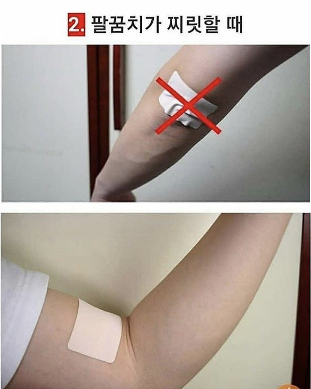 - 잘못된 방법 (X): 팔꿈치 관절 부위(접히는 부분)에 파스를 붙이는 방법. 관절 부위는 움직임이 많아 파스가 쉽게 떨어질 수 있고, 통증 유발점과 거리가 멀 수 있습니다.